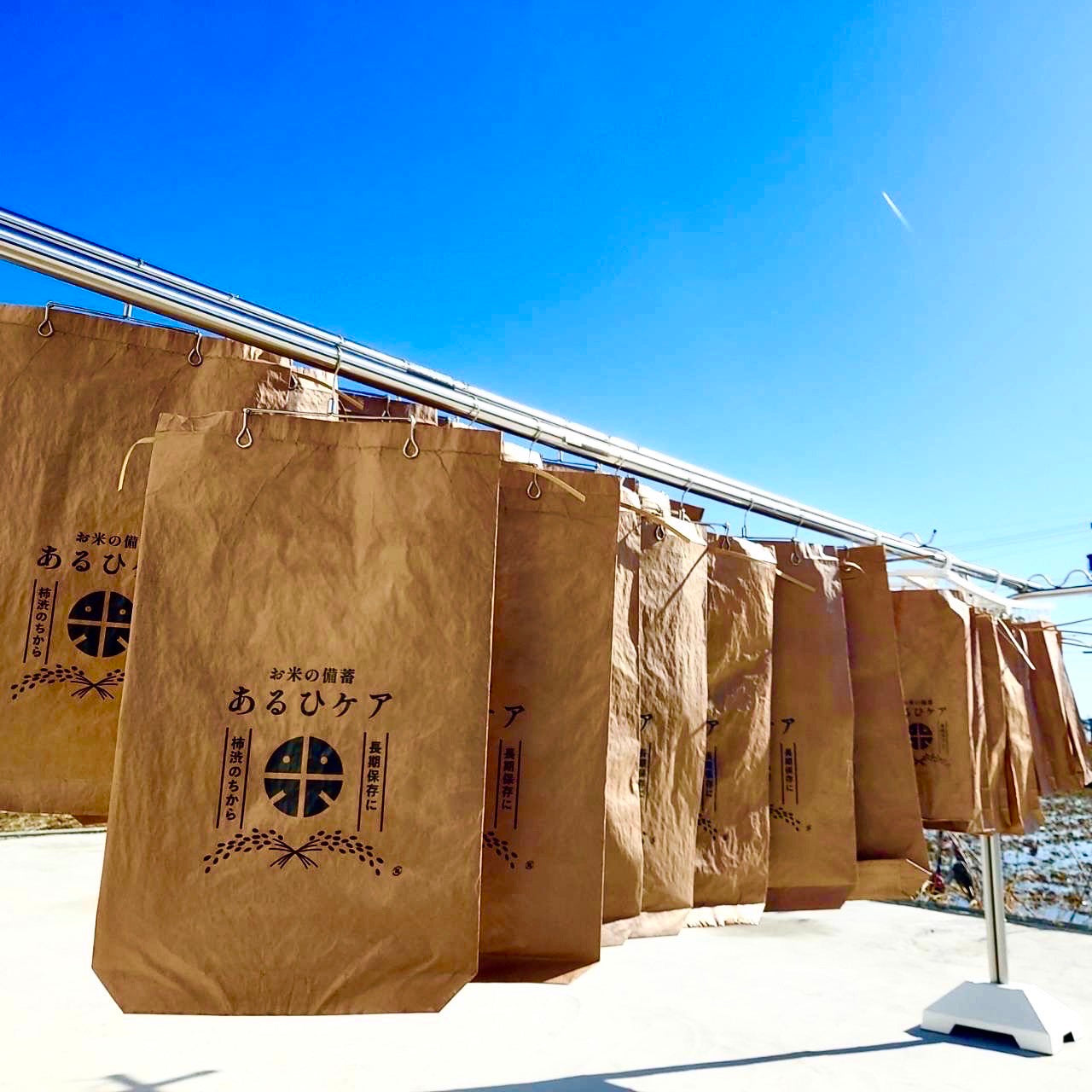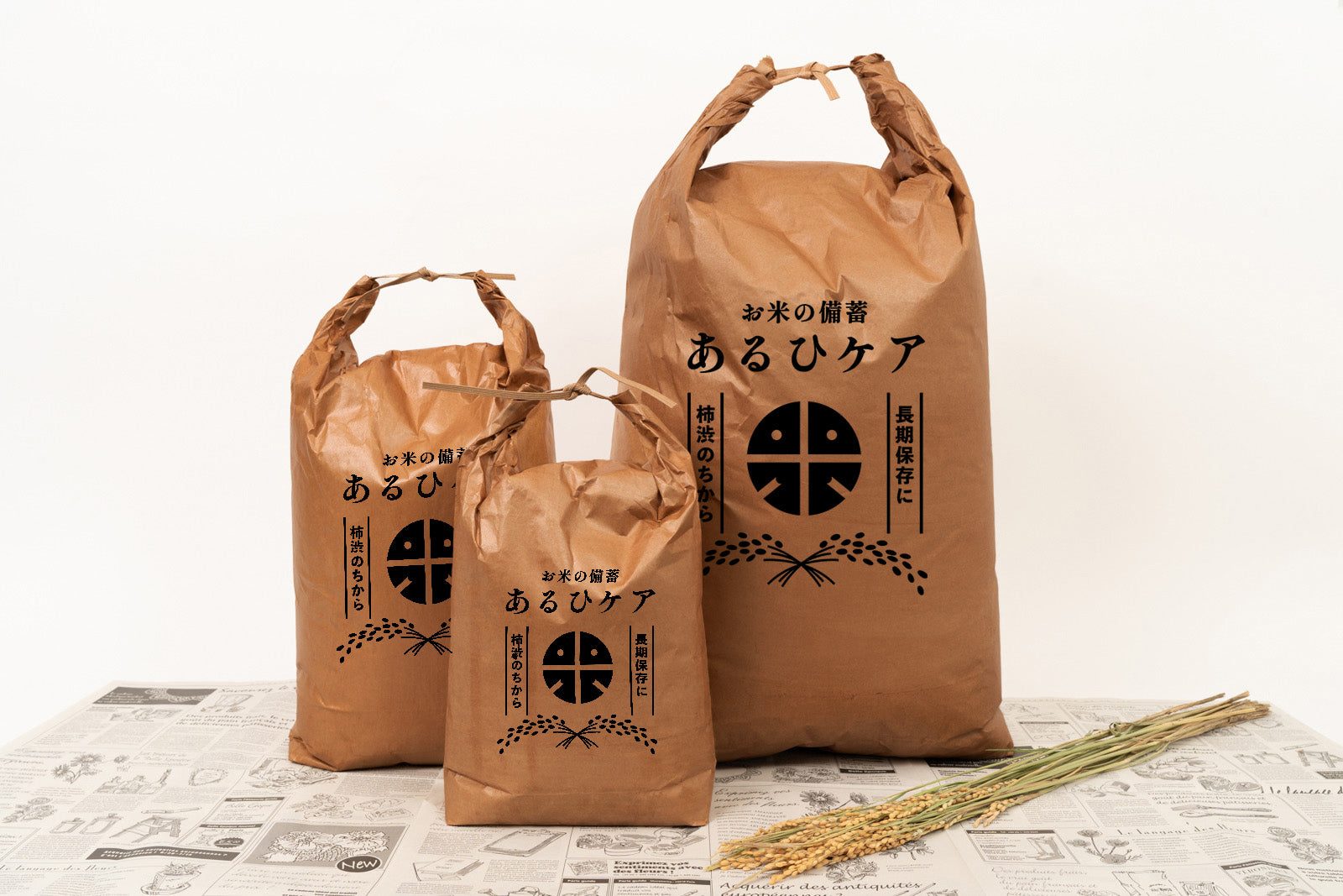 お米、玄米を購入時の袋から取り出し、当社の柿渋袋に直接移し替えてください。使用後は空袋を1日天日干しすれば繰り返しお使い頂けるので大変お得です。