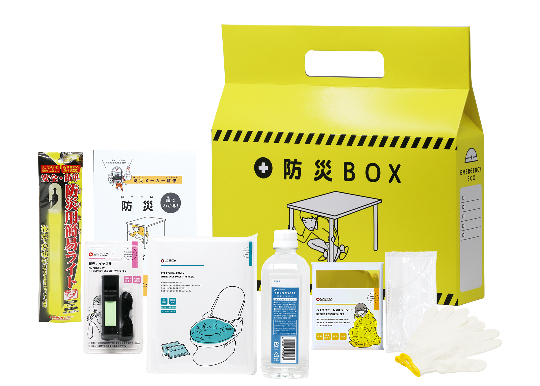 持ち手付き防災BOXX1、長期保存養老の天然500mlx1、トイレONE 3枚入×1、レスキューシート×1、マスク×1、蓄光ホイッスル×1、軍手×1、防災簡易ライト×1、防災ハンドブック×1 |